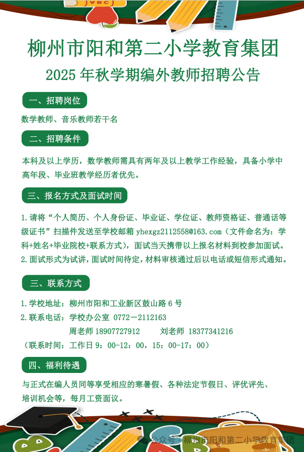 原文標(biāo)題:柳州市陽和第二小學(xué)教育集團2025年秋學(xué)期編外教師招聘公告