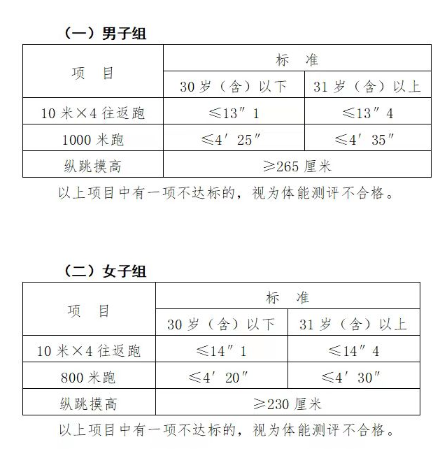 體測項目為縱跳摸高、10米×4往返跑和1000米(男)或800米(女)長跑,體能測試項目評分標(biāo)準(zhǔn)依據(jù)《公安機(jī)關(guān)錄用人民警察體能測評項目和標(biāo)準(zhǔn)(暫行)》執(zhí)行(見附件3),體能測試項目規(guī)則按照《公安機(jī)關(guān)錄用人民警察體能測評實施規(guī)則》執(zhí)行(見附件4)。