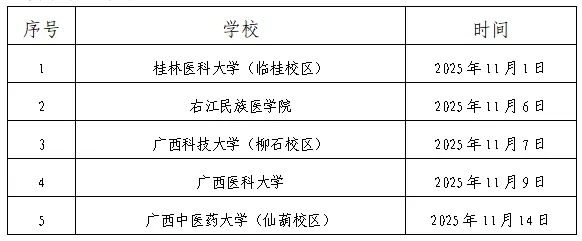 采取現(xiàn)場報名方式的人員請前往桂林醫(yī)科大學(xué)、右江民族醫(yī)學(xué)院、廣西科技大學(xué)、廣西醫(yī)科大學(xué)、廣西中醫(yī)藥大學(xué)等區(qū)內(nèi)各院校雙選會現(xiàn)場進(jìn)行應(yīng)聘。廣西區(qū)內(nèi)各院校雙選會舉辦時間詳見下表。