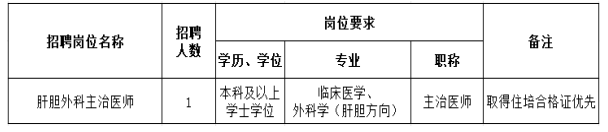根據(jù)醫(yī)院發(fā)展需要,現(xiàn)面向社會急招肝膽外科主治醫(yī)師1人,有關招聘事項公告如下: