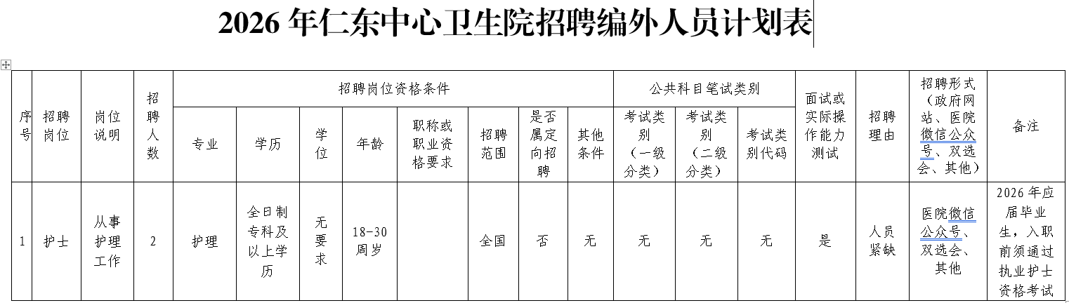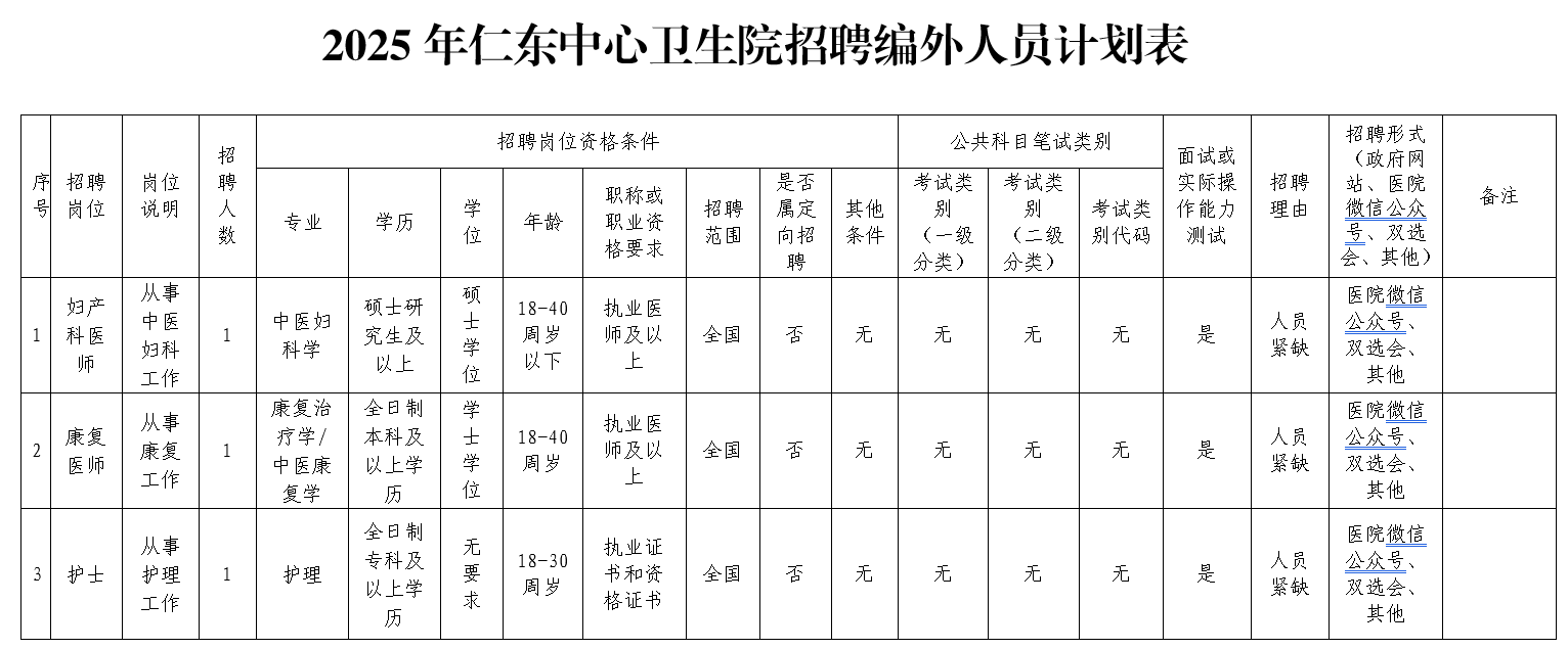 7.學(xué)歷、專業(yè)及其他任職要求詳見(jiàn)仁東中心衛(wèi)生院招聘編外人員計(jì)劃表。