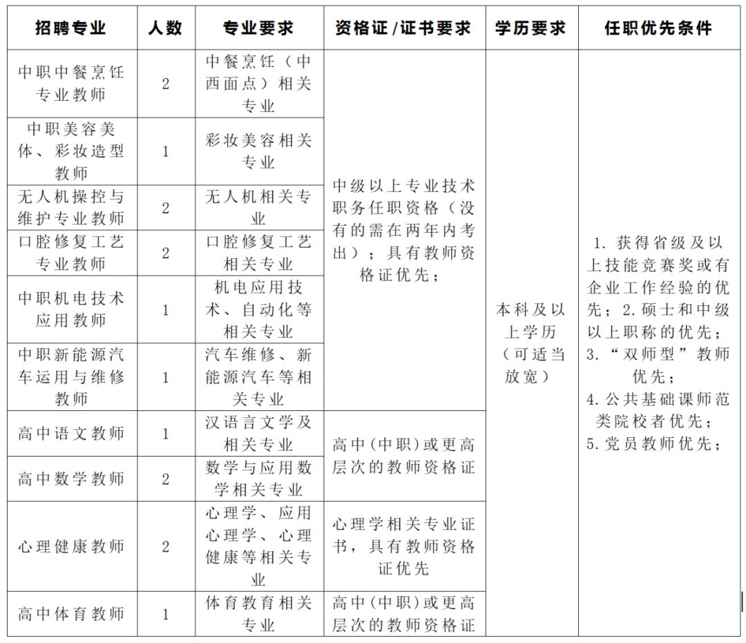 機電應(yīng)用技術(shù)、中餐烹飪、新能源汽車檢測與維修、平面設(shè)計、社會文化藝術(shù)、美發(fā)與形象設(shè)計專業(yè),各1人。