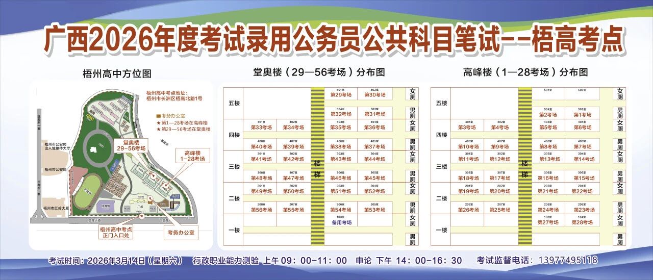 一、廣西2026年度考試錄用公務(wù)員(選調(diào)生)公共科目筆試將于3月14日舉行,梧州考區(qū)共設(shè)置10個(gè)考點(diǎn),請(qǐng)考生提前熟悉各自考點(diǎn)位置、周邊環(huán)境及交通情況,考試當(dāng)天提前出門做好準(zhǔn)備,準(zhǔn)時(shí)參加考試。