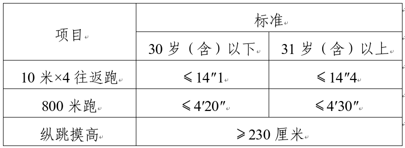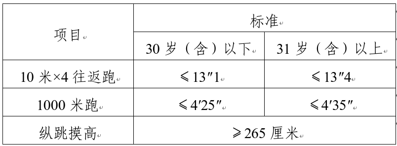 綜合管理類、執(zhí)法勤務(wù)類職位測(cè)查全部三個(gè)項(xiàng)目,三項(xiàng)全部達(dá)標(biāo)方為合格;警務(wù)技術(shù)類職位免予測(cè)查1000米(男)/800米(女)跑項(xiàng)目,其他兩項(xiàng)全部達(dá)標(biāo)方為合格;報(bào)考外語(yǔ)及少數(shù)民族語(yǔ)言翻譯緊缺職位的人員,體能測(cè)評(píng)三項(xiàng)中有兩項(xiàng)達(dá)標(biāo)的,視為合格。