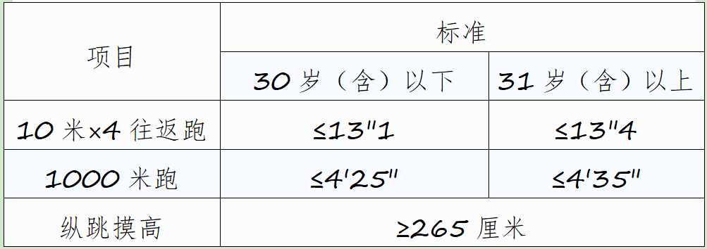 年齡計(jì)算時(shí)間截止到參加體能測(cè)評(píng)當(dāng)月。體能測(cè)評(píng)項(xiàng)目中,10米×4往返跑項(xiàng)目每人最多可測(cè)2次,男子1000米跑(女子800米跑)項(xiàng)目每人最多可測(cè)1次,縱跳摸高項(xiàng)目每人最多可測(cè)3次。1次測(cè)評(píng)達(dá)標(biāo),即視為該項(xiàng)目測(cè)評(píng)合格。體能測(cè)評(píng)所需的場(chǎng)地環(huán)境和器材,結(jié)合測(cè)評(píng)地點(diǎn)的實(shí)際情況設(shè)置。