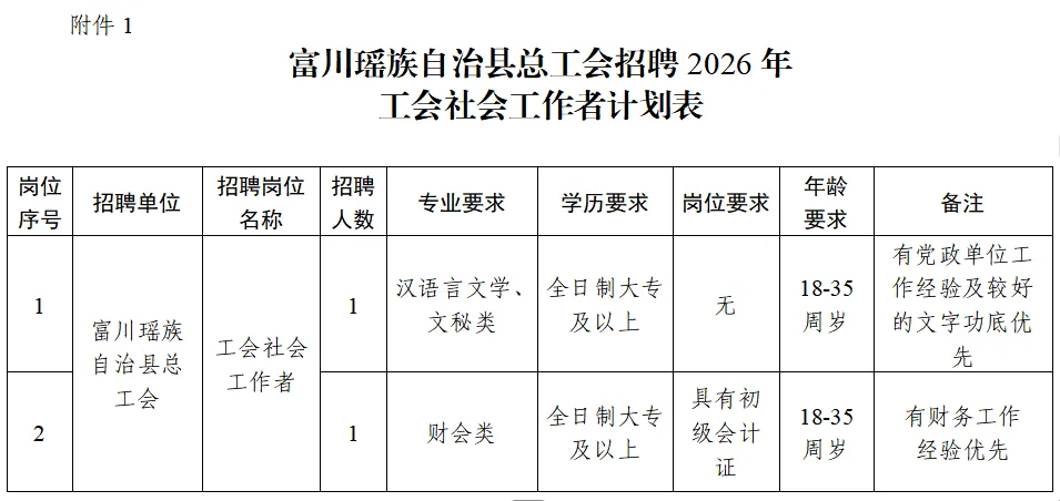 1.富川瑤族自治縣總工會招聘2026年工會社會工作者計(jì)劃表